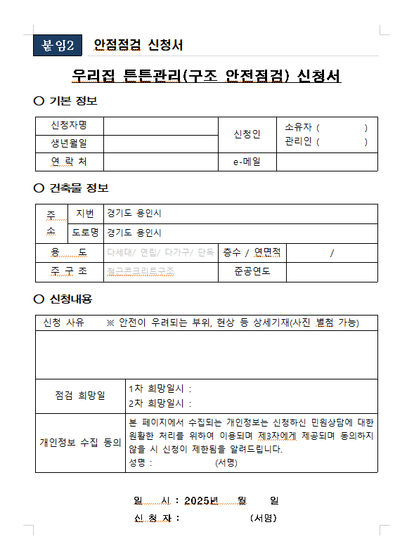 2025년에도 용인시민의 주거 안전을 위한 ‘우리집 튼튼관리 지원 사업’이 진행됩니다. 이 사업은 노후 주택을 보수하고 안전 점검을 지원하는 프로그램으로, 매년 많은 시민들이 혜택을 받고 있는 인기 정책 중 하나입니다.