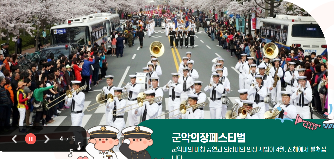 진해 해군기지 인근 도로에서 펼쳐지는 군악대 퍼레이드는 진해군항제를 상징하는 대표 프로그램입니다.