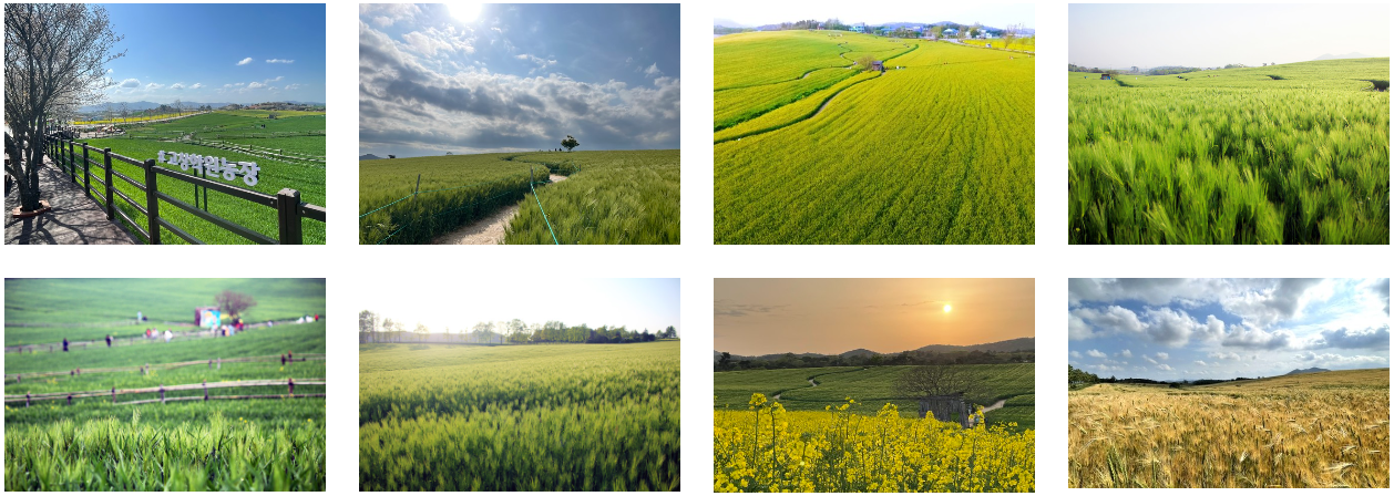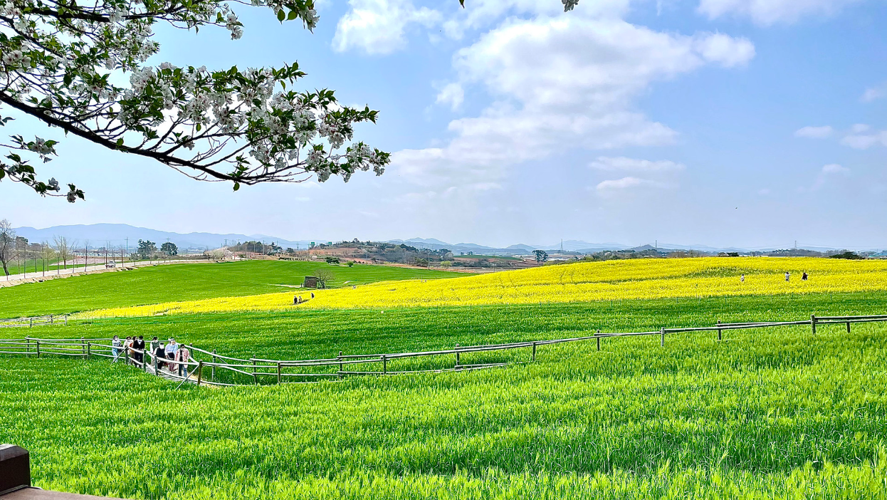 특히 봄에는 청보리와 유채꽃이 장관을 이루며, 가을에는 메밀꽃과 황화코스모스, 백일홍이 아름답게 피어납니다.