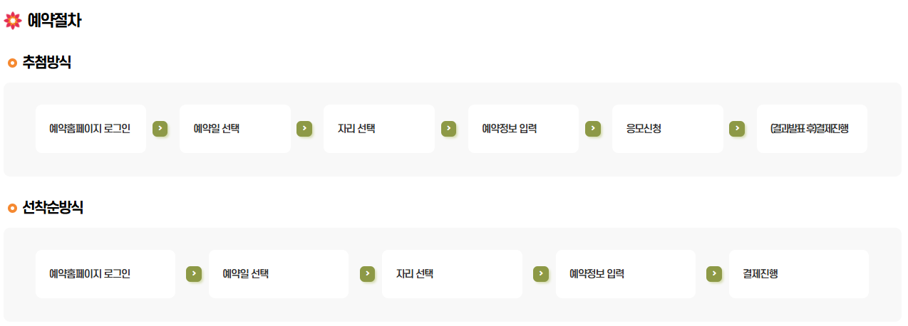 온라인 예약만 가능하며, 대부분 선착순으로 빠르게 마감됩니다. 특히 주말과 연휴는 최소 2~3주 전에 예약해야 원하는 자리를 잡을 수 있어요.