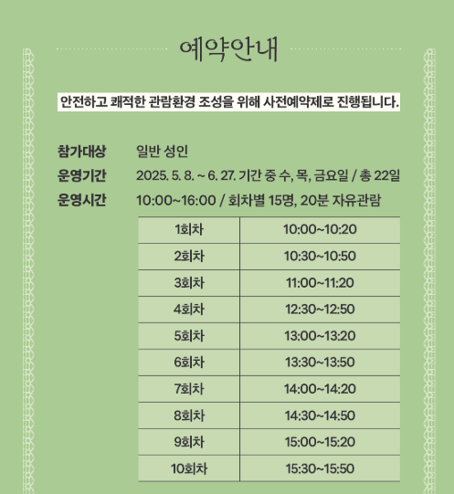 | 관람기간 | 2025년 5월 8일 ~ 6월 27일 (수~금요일만 운영) |